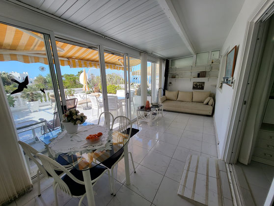 Interiér nabízí jednu ložnici s vestavěnými skříněmi, koupelnu, obývací pokoj s otevřenou kuchyní a zasklenou část terasy sloužíc...
